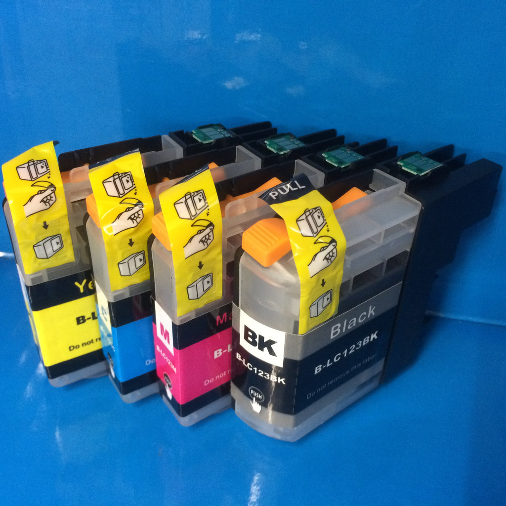 Set Compatible Ink Cartridges for For use with Brother DCP-J132W, DCP-J152W, DCP-J172W, DCP-J552DW, DCP-J752DW, DCP-J4110DW, Brother MFC-J4410DW, MFC-J4510DW, MFC-J4610DW, MFC-J245, MFC-J470DW, MFC-J4710DW, MFC-J650DW, MFC-J6520DW, MFC-J6720DW, MFC-J6920DW, MFC-J870DW printers and more. 1 X LC123BK BLACK INK CARTRIDGE, 1 X LC123C CYAN INK CARTRIDGE, 1 X LC123M MAGENTA INK CARTRIDGE, 1 X LC123Y YELLOW INK CARTRIDGE.
